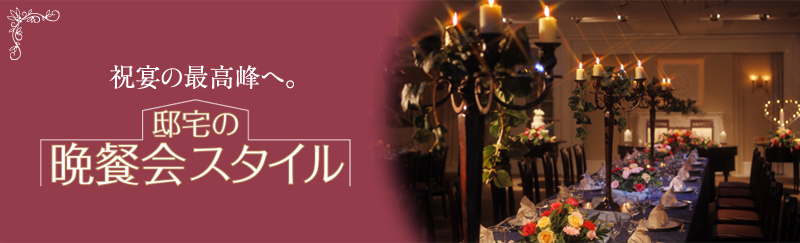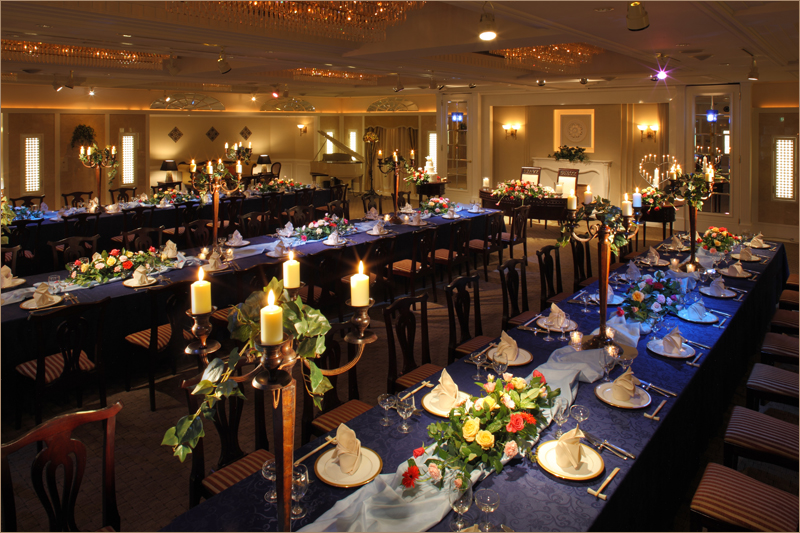 ドアを開けた瞬間から広がる、 別世界に足を踏み入れたかのような心地良い緊張感。 整然と並べられたセッティングに配された ロイヤルブルーのテーブルクロス、バラの装花。 そして豪華な燭台が優雅に煌くフォーマルな空間は、 まるで「宮殿の晩餐会」のよう。 披露宴の最高峰コーディネート「邸宅の晩餐会」で、 おふたりの人生最高の1日を華麗に演出してみませんか。