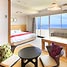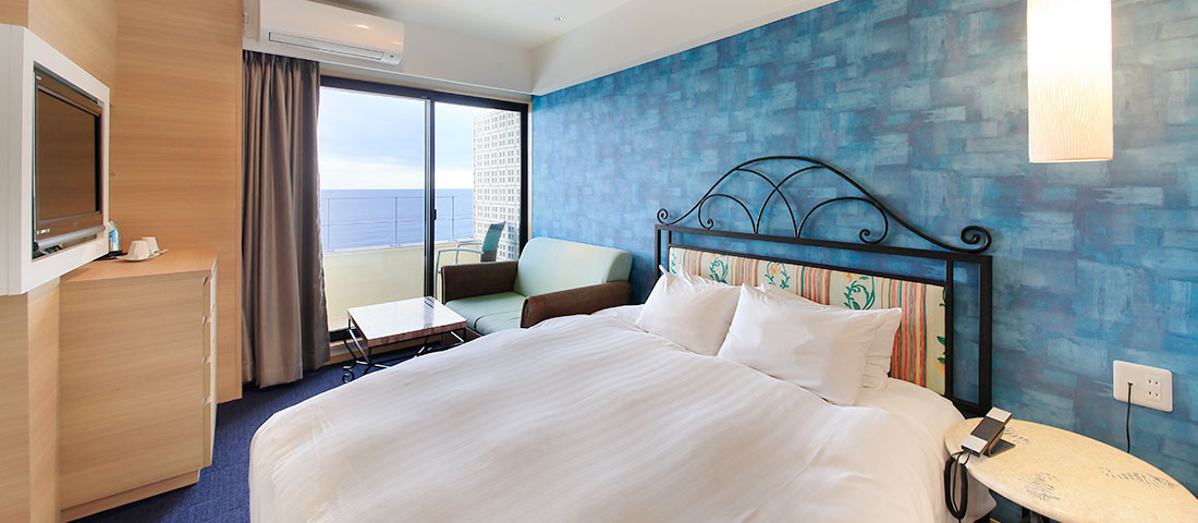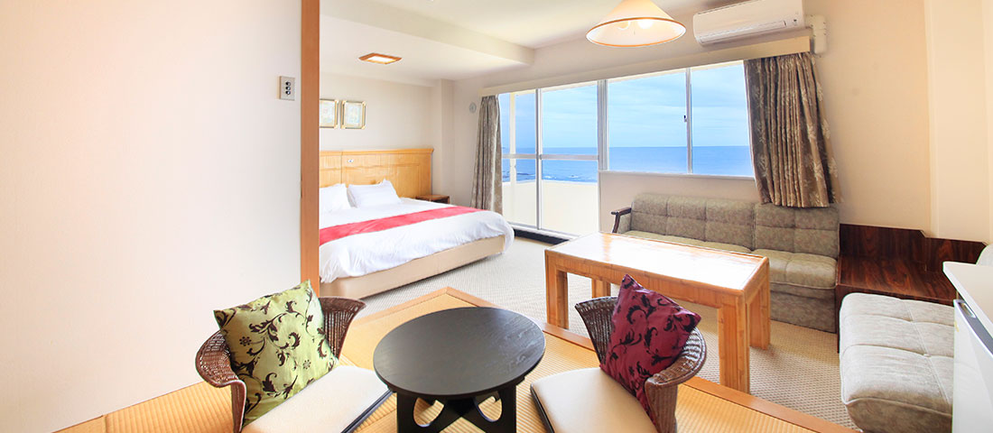 平砂浦海岸を望むオーシャンビューのゲストルームはダブルベッドと8畳のタタミを配した40m2のゆとりある広さです。