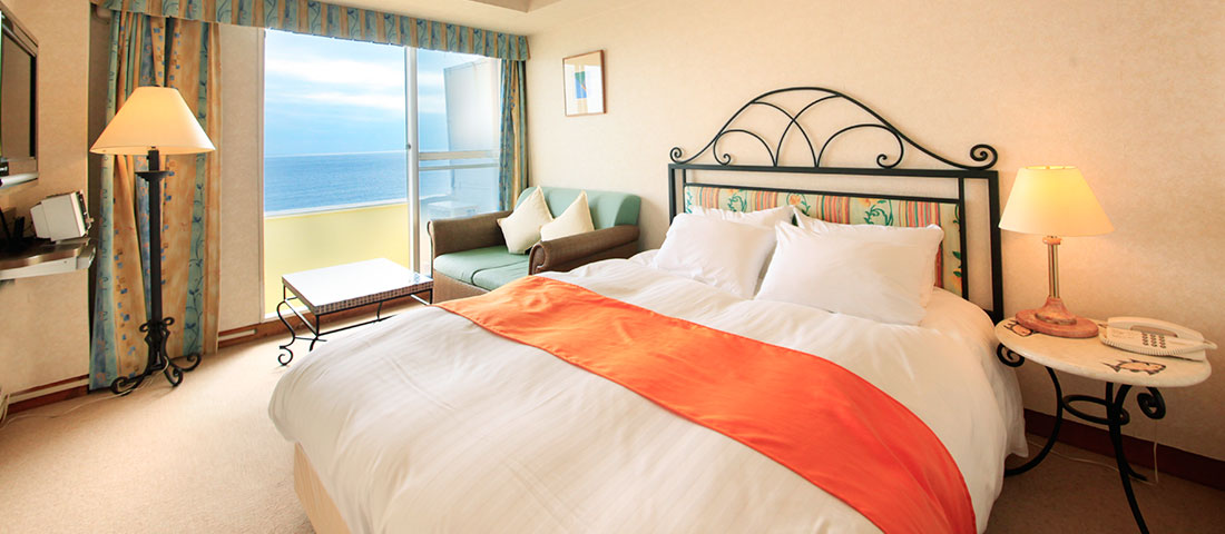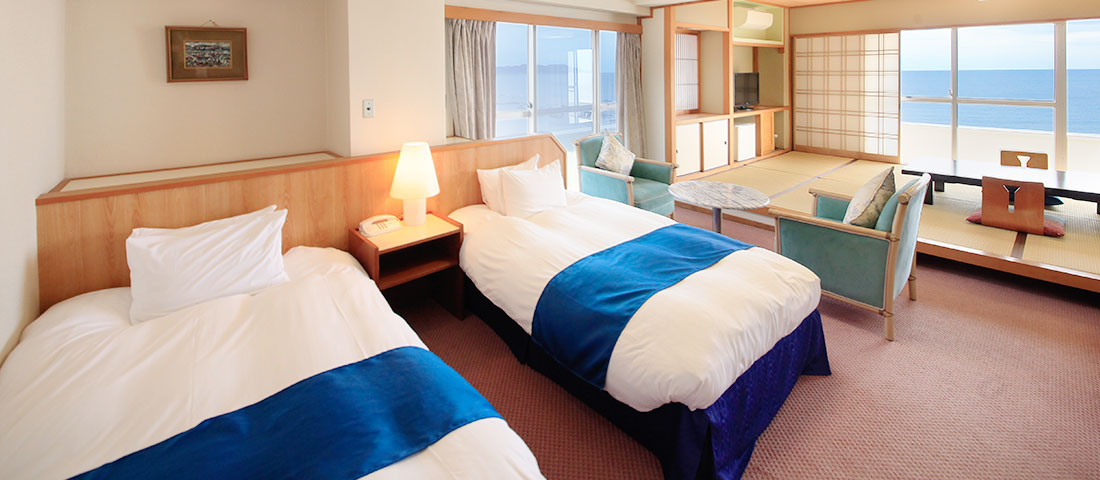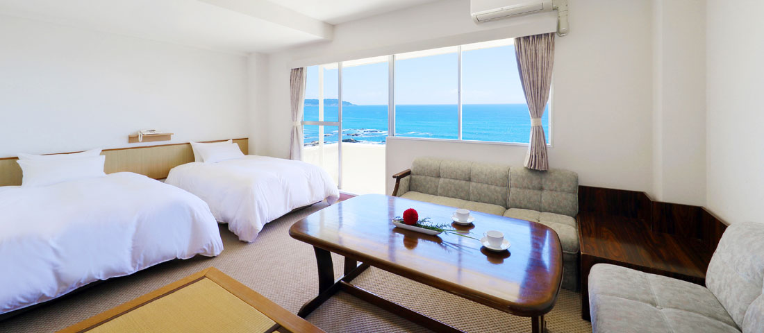 平砂浦海岸を望むオーシャンビューのゲストルームはツインベッドと12畳のタタミを配した60㎡のゆったりとした角部屋ならではの広さが自慢です。