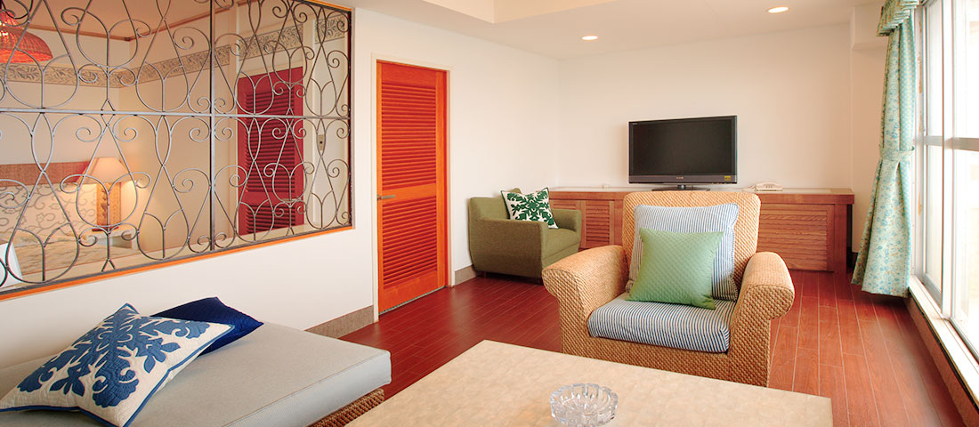 平砂浦海岸を望むオーシャンビューのゲストルームはダブルベッドの寝室とデイベッド付のリビングとにわかれた40m2の洋室です。