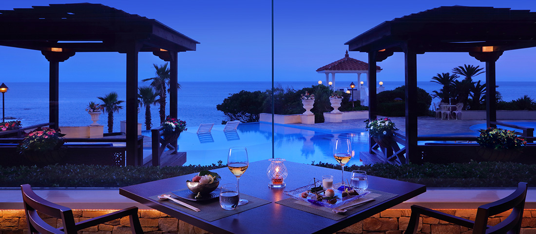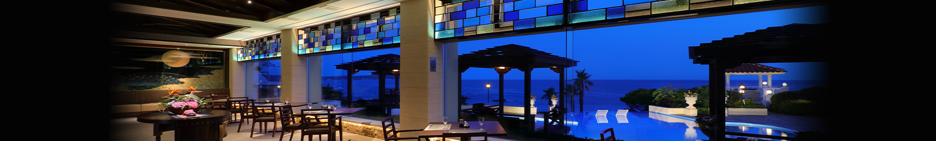 ライトアップされたプールサイドと刻々とその表情を変化させる平砂浦の絶景を望むメインダイニング「碧海」。房総の新鮮な魚介類を中心に滋味豊かな食材をモダンにアレンジした「季節の会席」をご用意いたします。